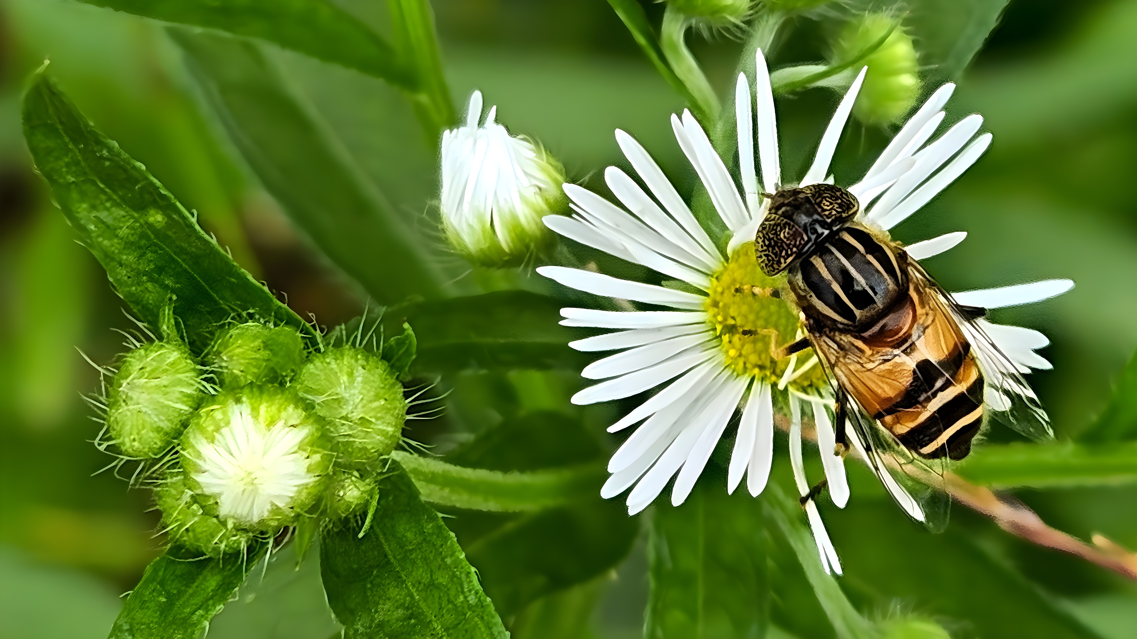 미국쑥부쟁이 꽃과 오줄루리꽃등에 (Eristalinus quinquestriatus) (부분확대)