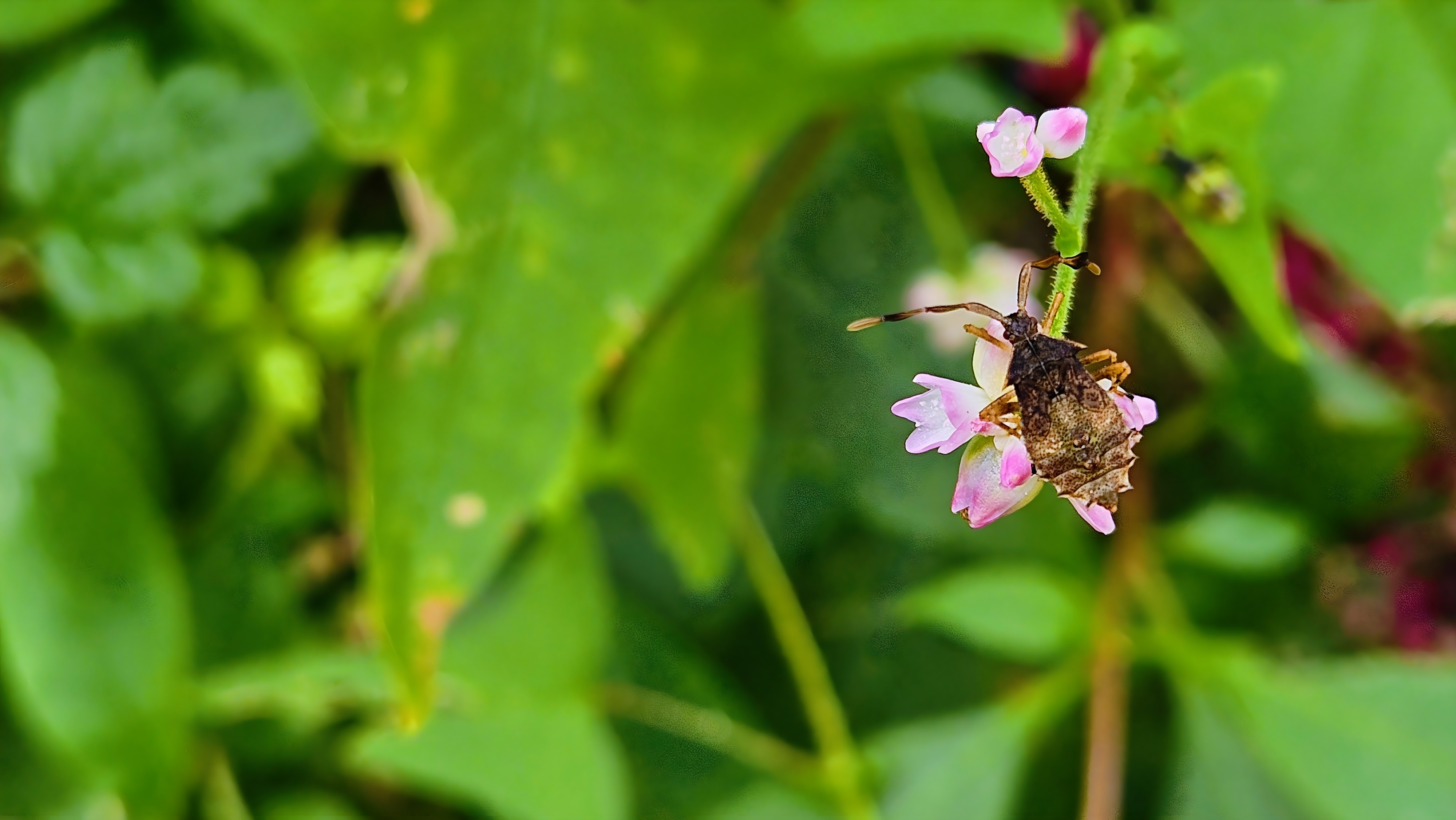 노린재 약충이 가시덩굴여뀌 꽃에 앉아있습니다.