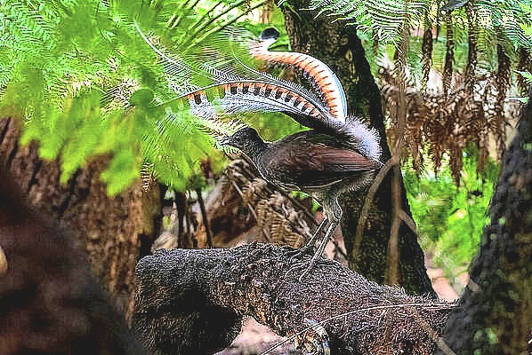 As the male superb lyrebird performs its courtship or territorial display, it turns slowly around and pours out a torrent of notes that includes a clever mimicry of the calls made by other forest birds. |