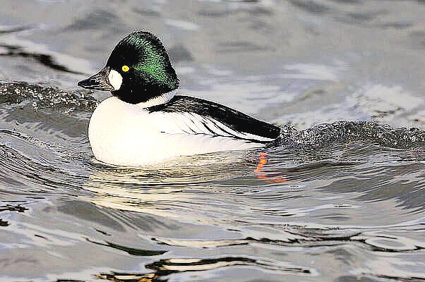 The common goldeneye winters on estuaries and sheltered coastal waters across Eurasia and North America.. |